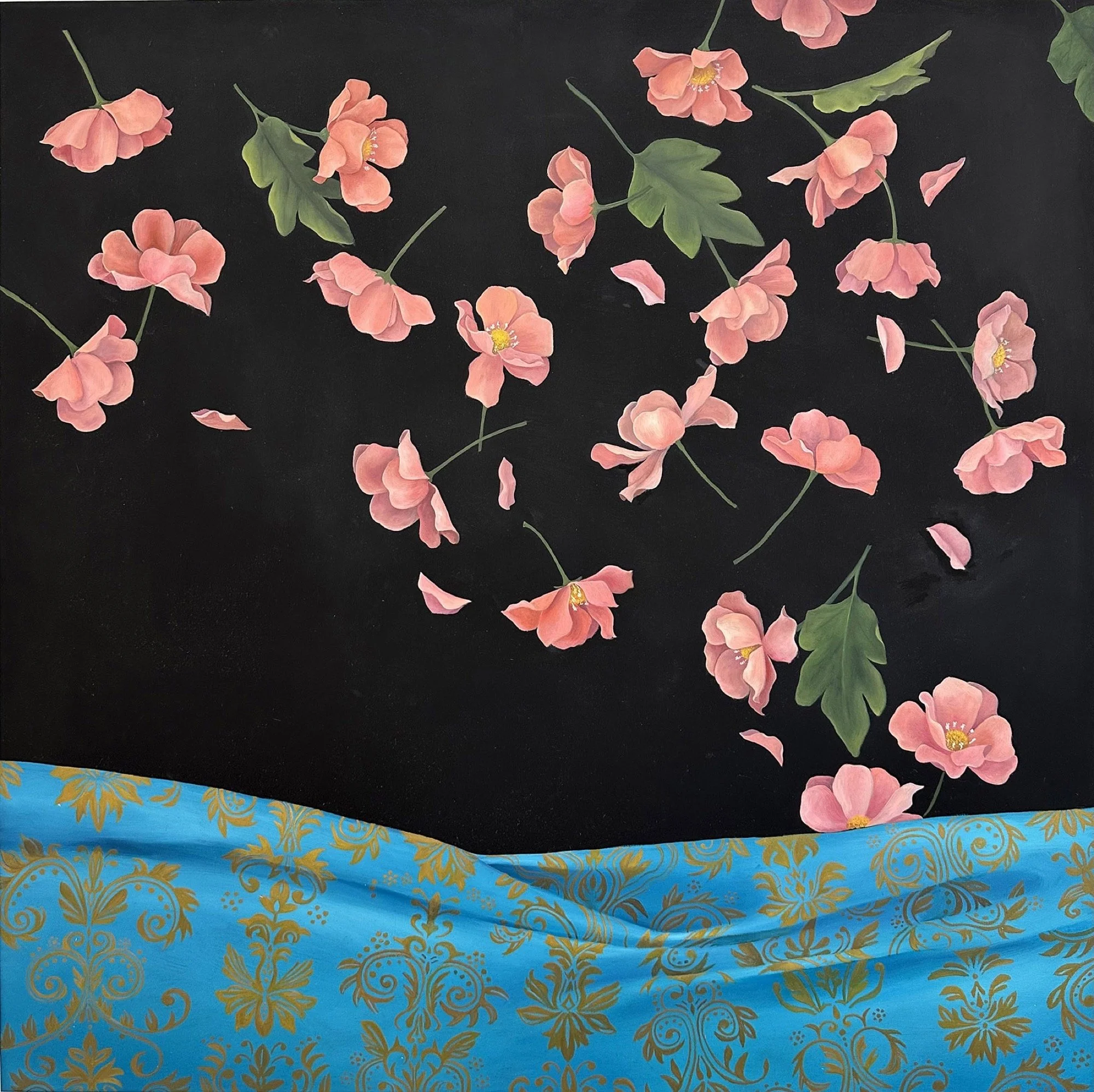 This interest in the natural world and a world of my own creation has been a unifying theme in my work for many years. I have returned again and again to paint natural objects such as stones, leaves, feathers and twigs, which sometimes float with an improbable weightlessness against invented skies. In the last few years I have been enamored with colorful, patterned swatches of cloth and in some of these paintings the fabric forms itself into imaginary waves or goddess-like totemic figures. In this body of work the images have naturally formed themselves into pairs, one responding to the other and becoming duets.