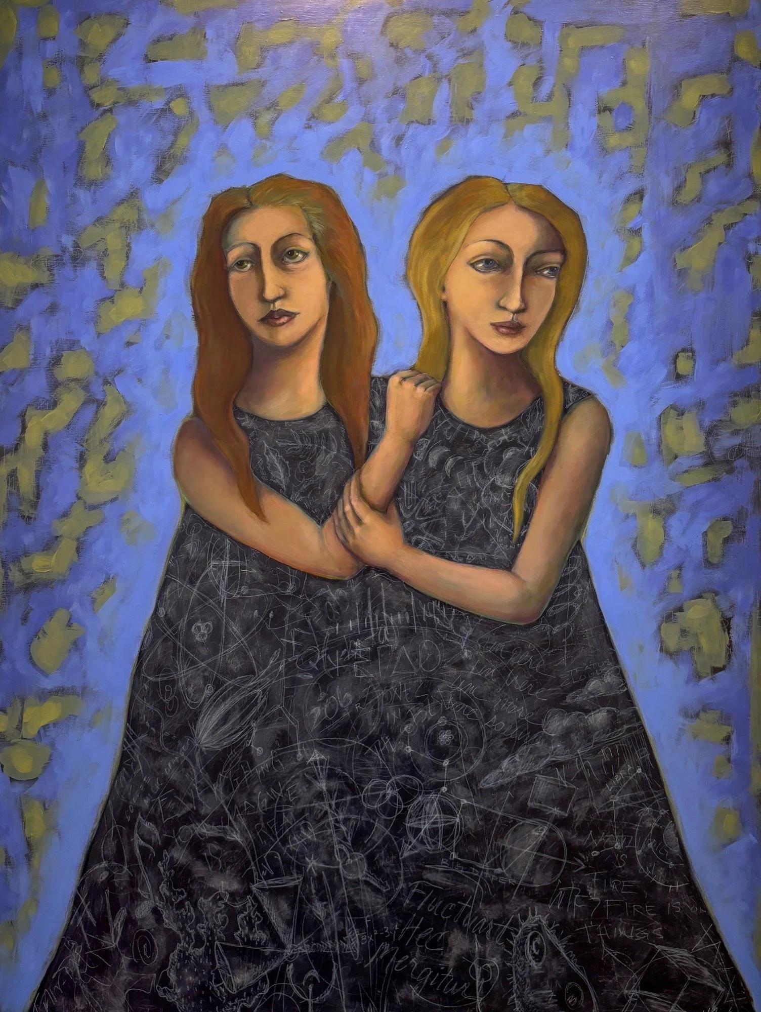Esme & Harriett, Patron Saints of Random Thoughts & Things Forgotten, 2025, Acrylic on panel, 48 x 36 in