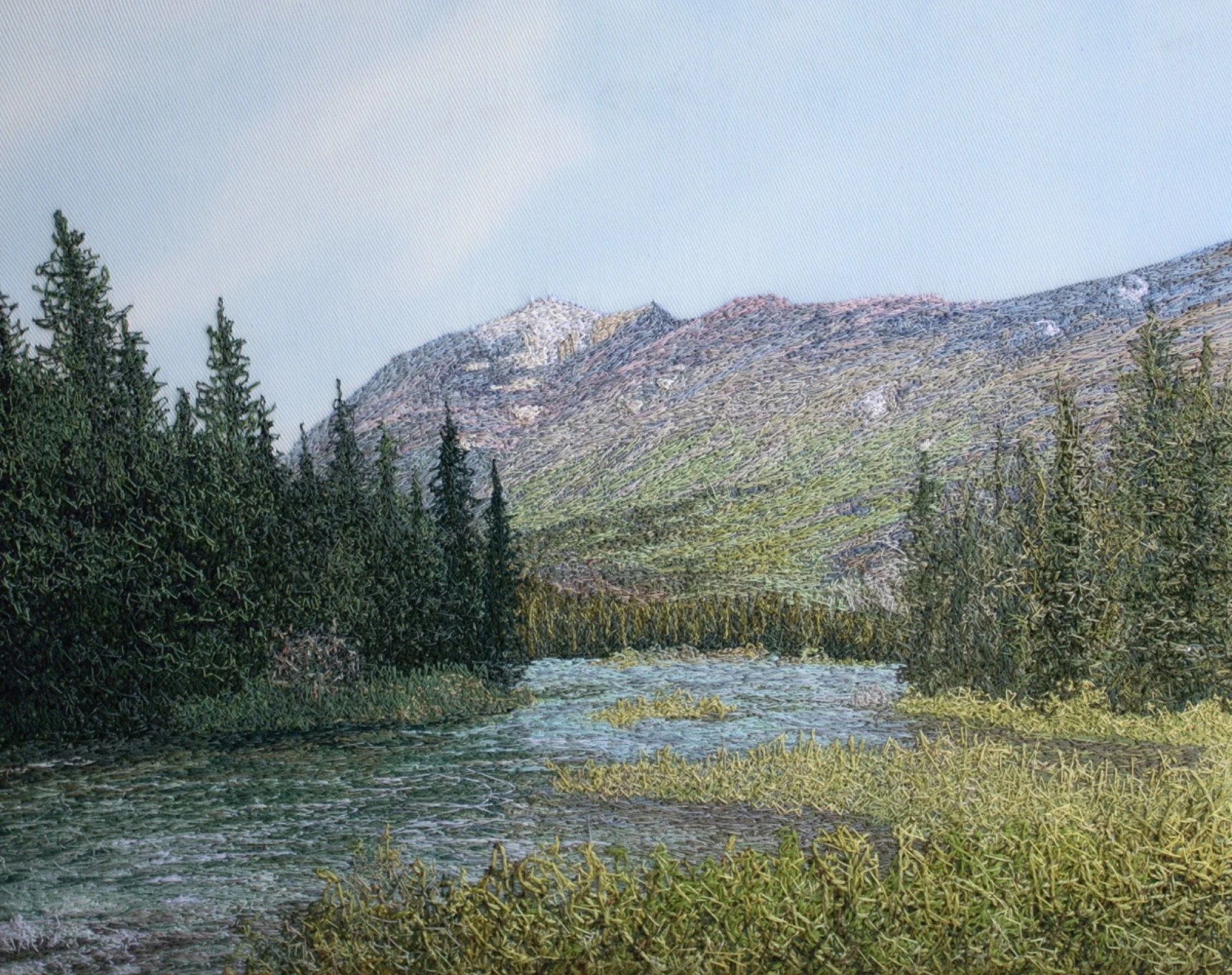 Her creative process takes significant time and work so that she only produces a few paintings each month. She begins by dyeing cotton fabric for sky and land and then spends many hours sewing straight and zigzag stitches with a sewing machine. Threads are changed frequently to add color and tone to the image. To contrast the thread work, loose wool, dyed ribbons, or tulle are incorporated. French knots and straight stitches are hand embroidered to add more detail. She enjoys the slow, repetitive process of stitching and feels that this creates a sense of calm analogous to the quietness and beauty of the land itself.